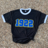 Black and white ringer tee with 1922 chenille patch.