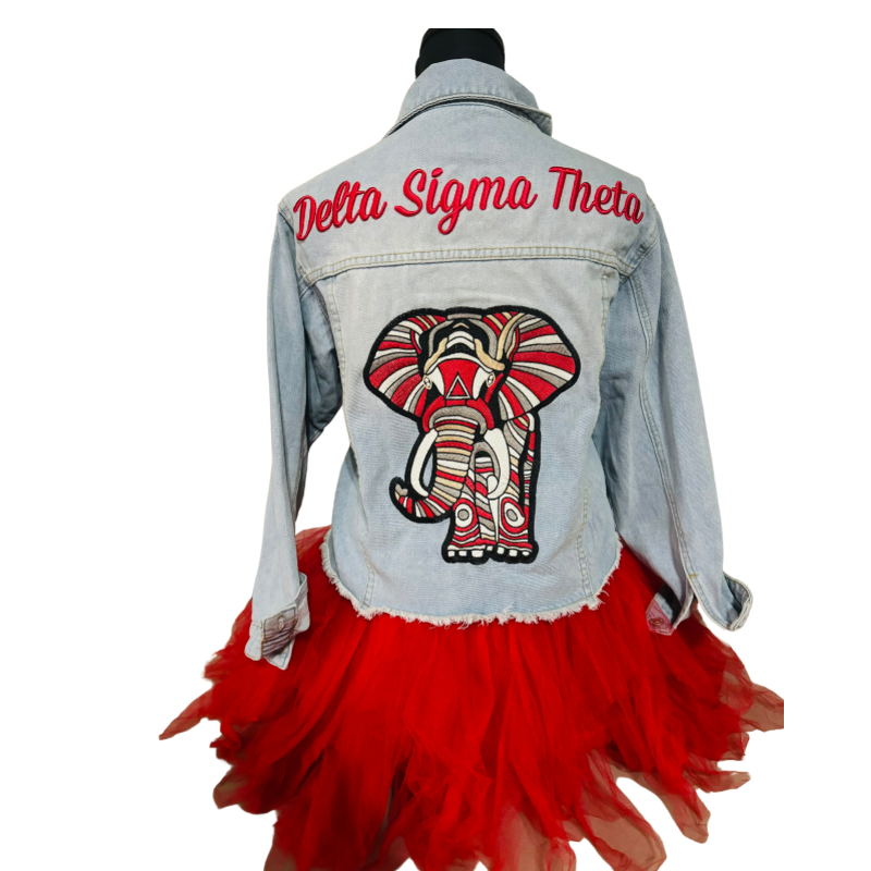 Fully embroidered 3/4 sleeve denim jacket with 3D letters. Waist length.