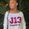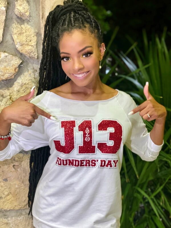 Delta Sigma Theta black pearl sleeved tee with custom ΔΣΘ chenille lettering. Soft feminine cut with 5% stretch. Size up for a
