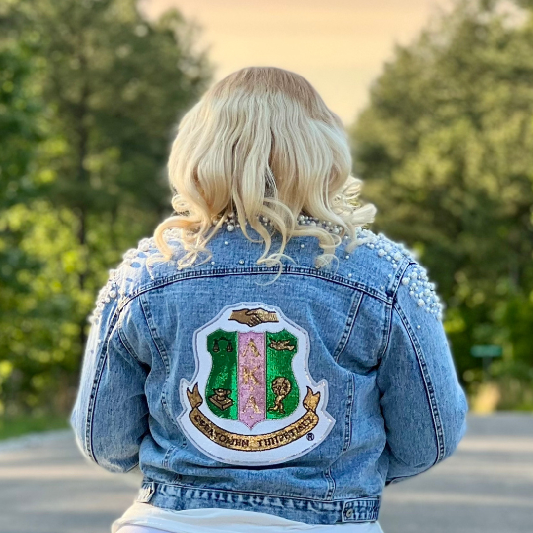 Make a bold, stylish statement with this pearl-embellished denim jacket featuring an oversized embroidered AKA shield. Designed for confident members who want to shine at events or in everyday wear.