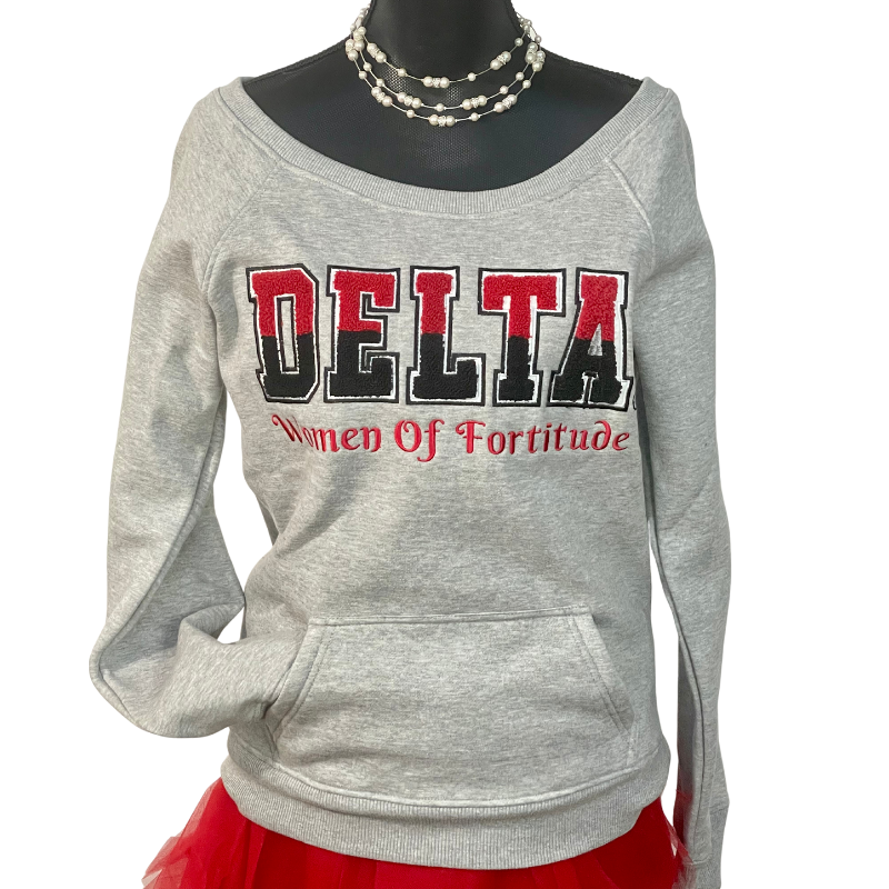 Gray off the shoulder pocket fleece with chenille design.