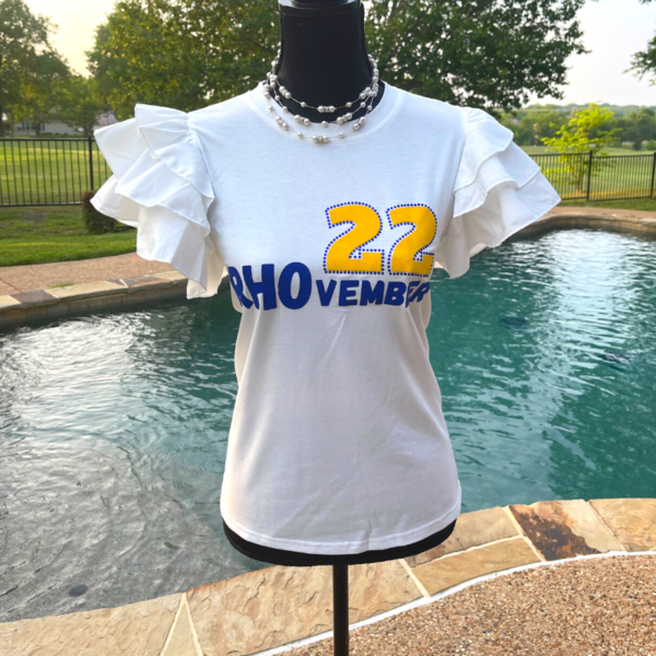 Ruffle tee with custom “Rhovember” design. True to size.