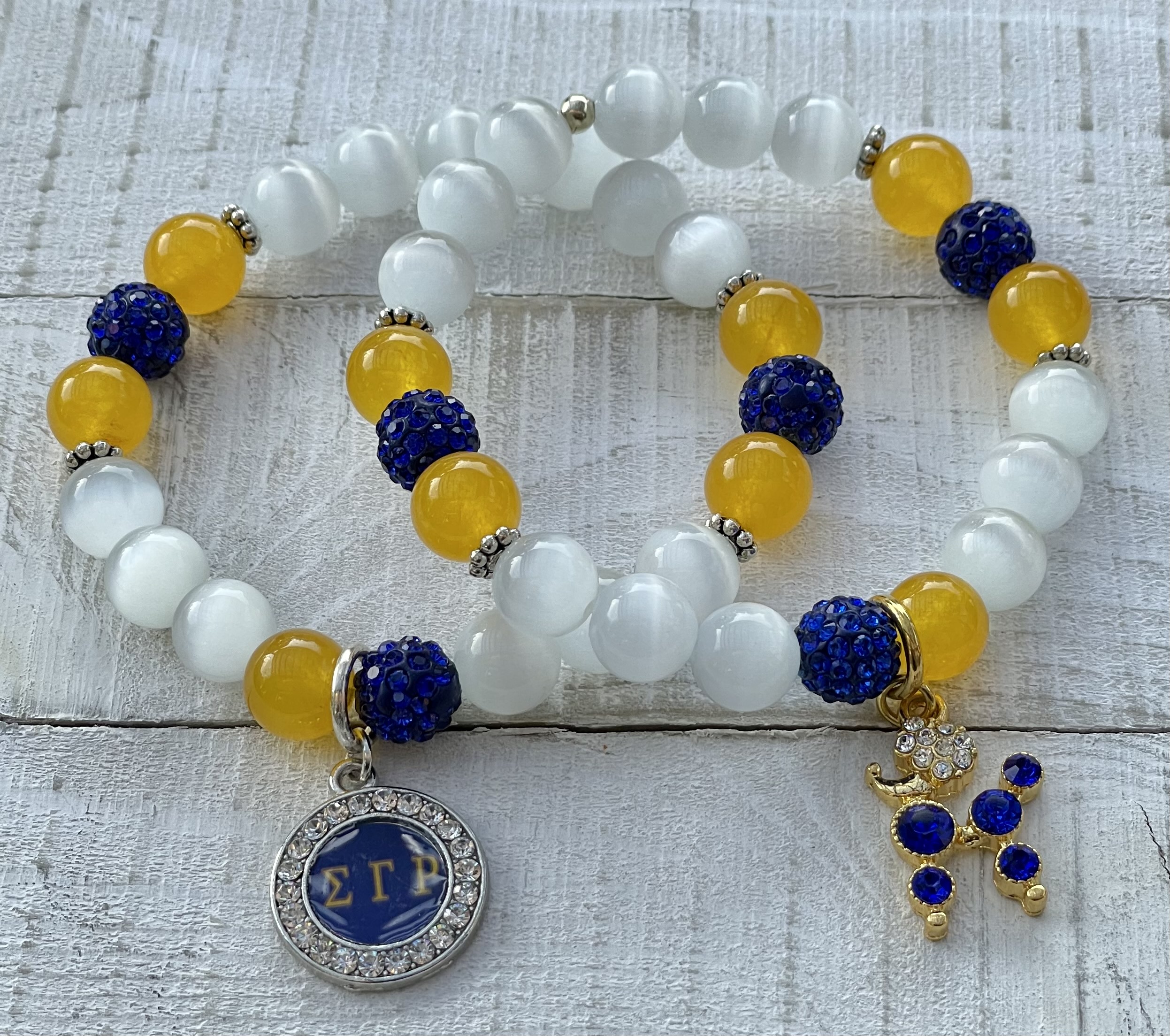 Beautiful array of custom beads accented in gold. Customized with SGRho inspired charms. Choose one or two!