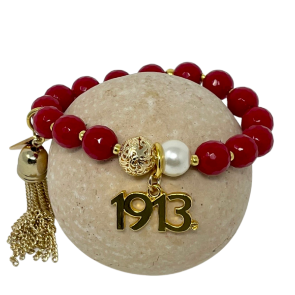 Customize red faceted beads with gold accents and gold 1913 and tassel charm.