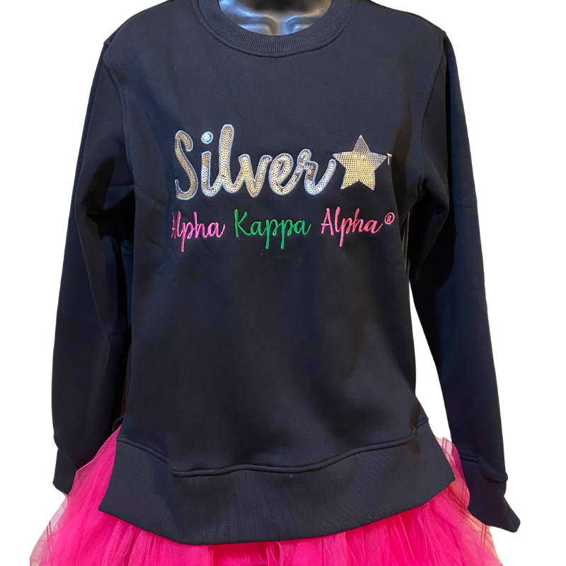 Custom Silver Star soft pull over fleece. Sequin Silver Star with embroidered outline and Alpha Kappa Alpha script. Feminine cut for a more tailored fit.