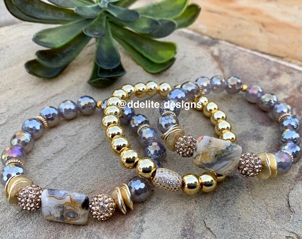 One of DD Elite’s Top Selling Signature Stone Bracelets. Handcrafted with Golden Hues of Iridescent Beads Accented with a Chic Custom Stone.