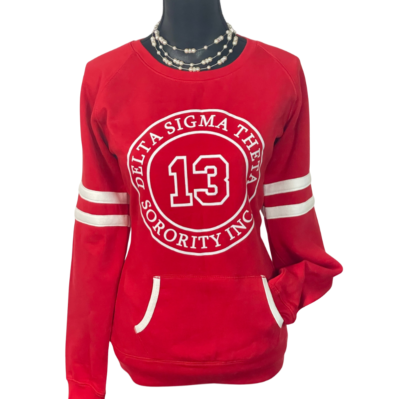 Delta Sigma Theta black pearl sleeved tee with custom ΔΣΘ chenille lettering. Soft feminine cut with 5% stretch. Size up for a