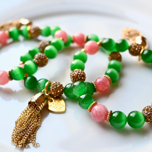 Our Signature elite bracelet has our custom 1908 signature charm or pretty charm. Beautiful salmon and green beads accented with pearl &